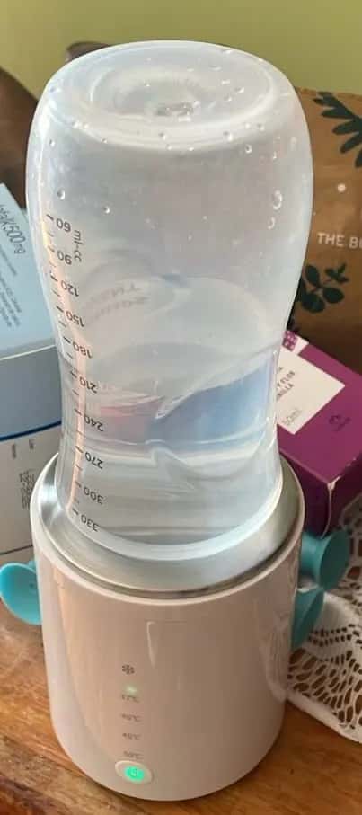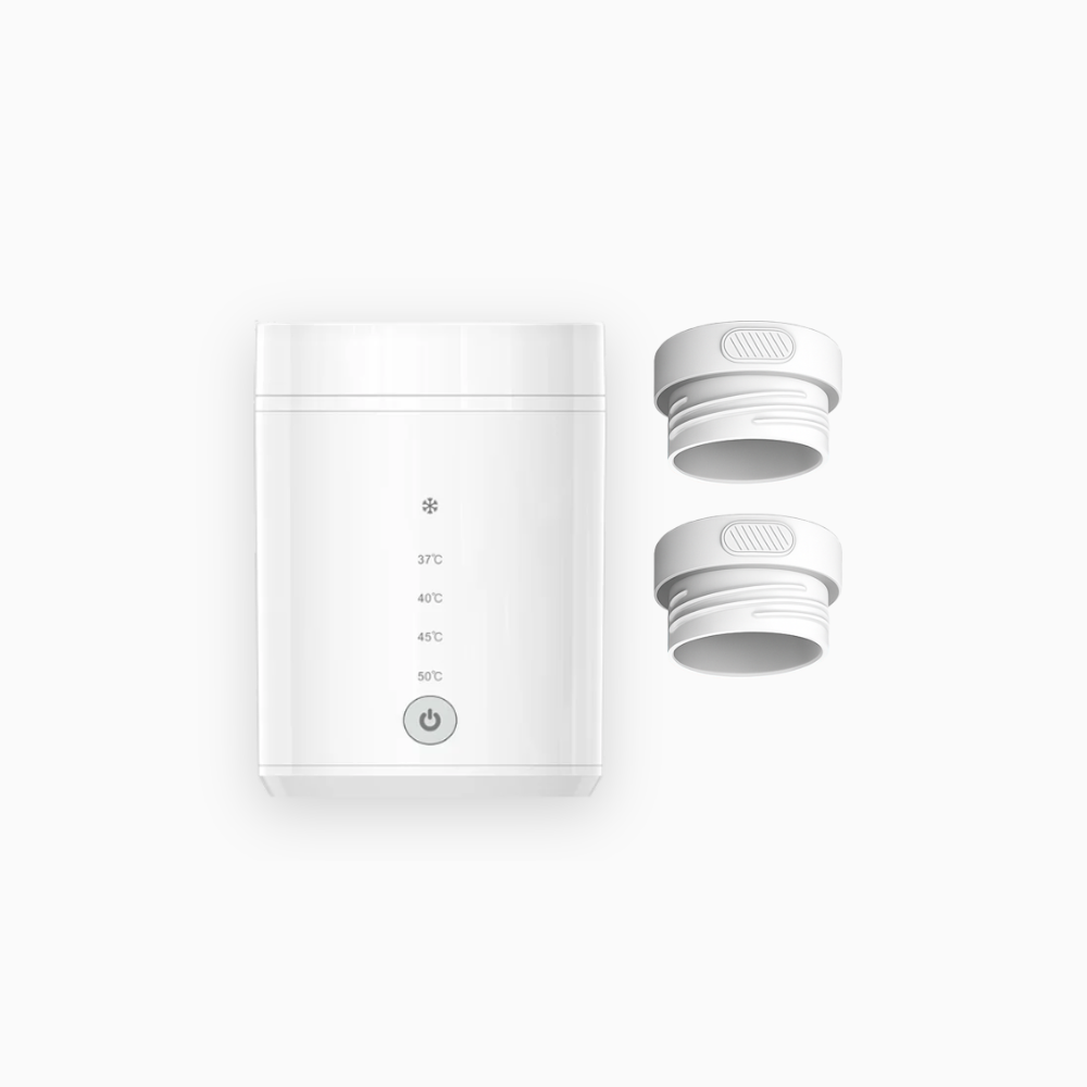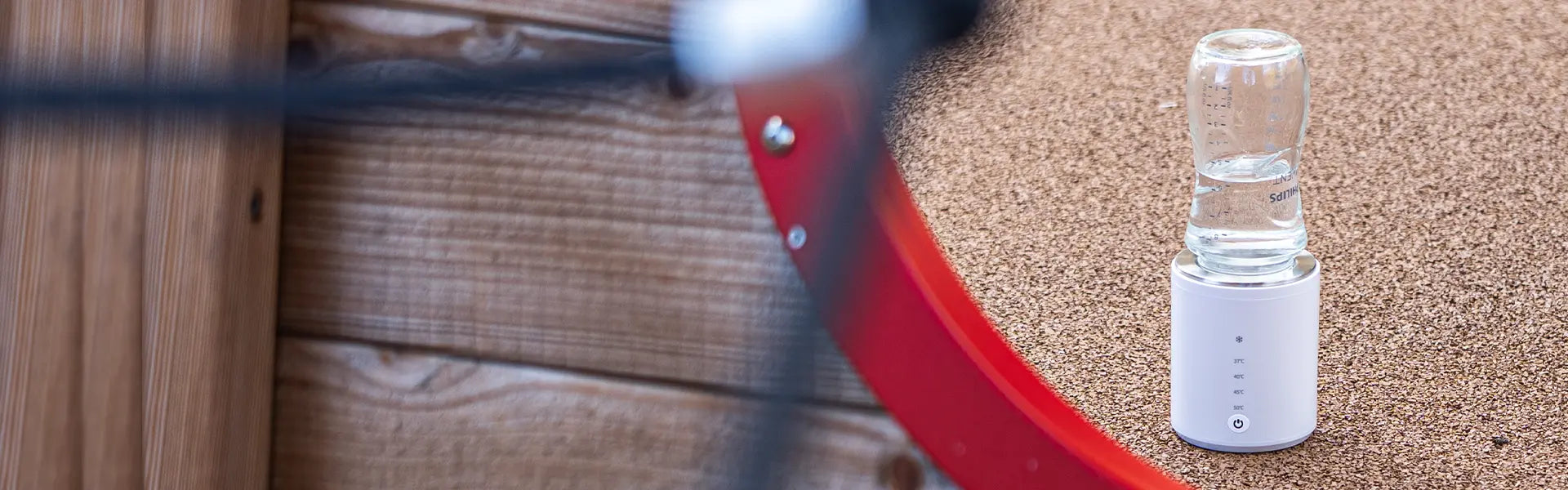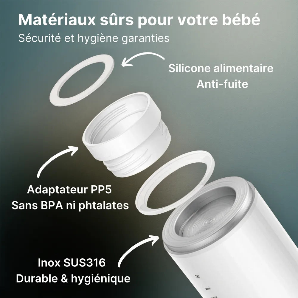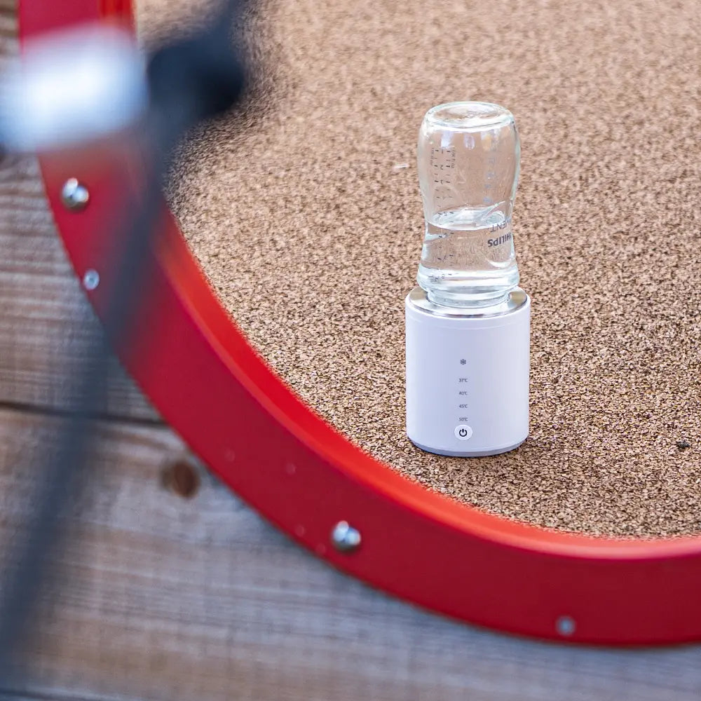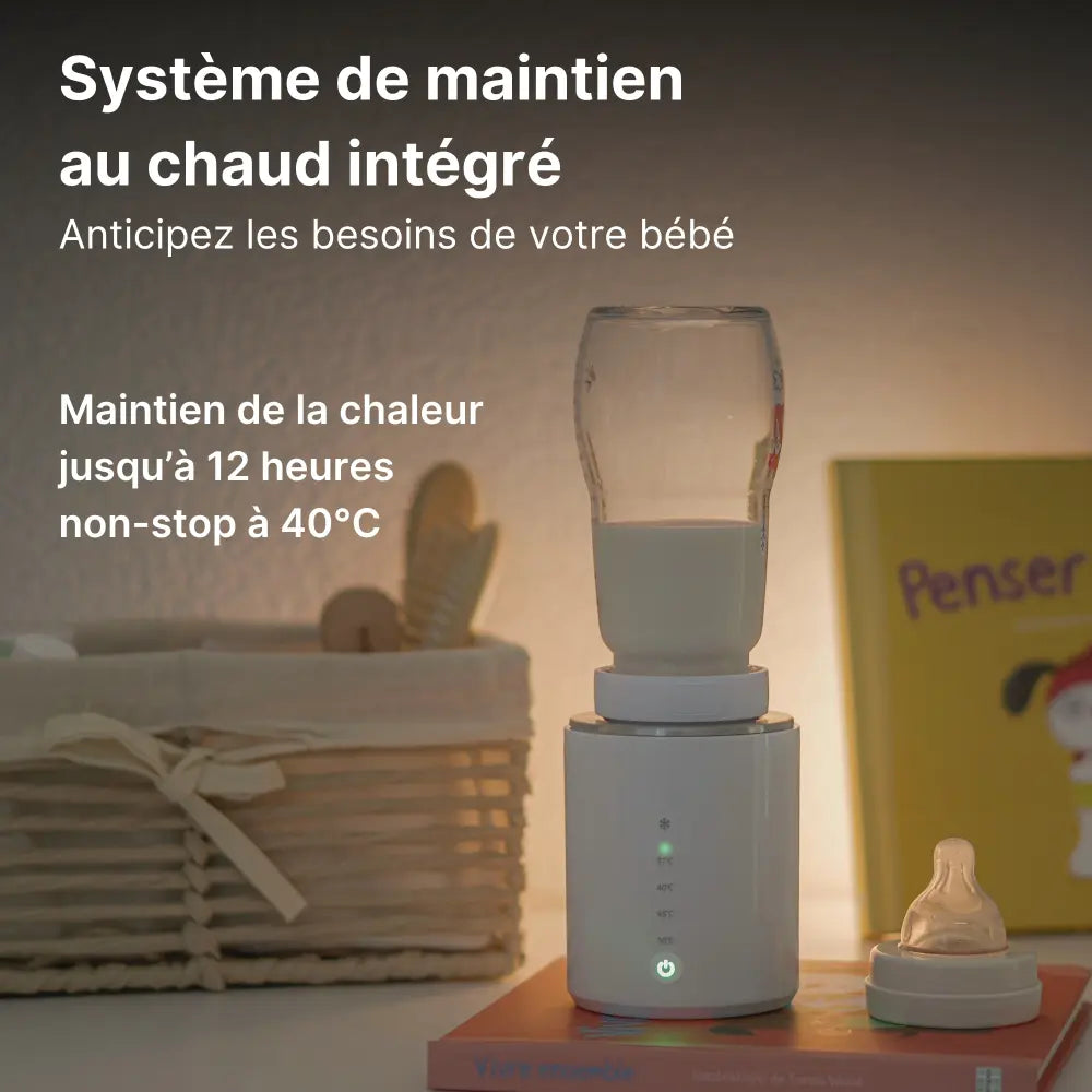 Le chauffe-biberon nomade qui élimine les galères de préparation. Vissez votre biberon directement dessus, chauffez, c'est prêt. Pas de transvasement, pas de complications.
